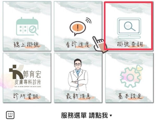 您可以於官方LINE上服務選單中的【掛號查詢】(如下圖)